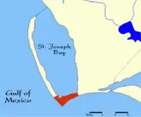 Cape San Blas is part of a peninsula in Gulf County, Florida, extending westward from the mainland of Florida, separating St. Joseph Bay to the north from the Gulf of Mexico to the south. It is fifty-nine miles southeast of Panama City. The St. Joseph Peninsula extends northward from the west end of Cape San Blas. It is approximately 10 miles (16 km) south-southwest of the town of Port St. Joe, located at coordinates 29°39′49″N 85°21′20″W / 29.66361°N 85.35556°W.