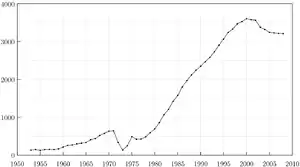 The Espy file,[26] compiled by M. Watt Espy and John Ortiz Smykla, lists 15,269 people executed in the United States and its predecessor colonies between 1608 and 1991. From 1930 to 2002, there were 4,661 executions in the U.S., about two-thirds of them in the first 20 years.[27] Additionally, the United States Army executed 135 soldiers between 1916 and 1961 (the most recent).[28][29][30]
