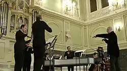 The Cappella Neapolitana was founded in 2016 by the musicologist and conductor Antonio Florio (it), who studied under Nino Rota,[1][2] as well as participating in events at the church Chiesa della Pietà dei Turchini.[3] The name of church, conservatory, and now the modern cappella and music centre go back to the turquoise (Italian "turchino") shirts worn by the original children of the institute. The association between church, conservatory, and commercial opera productions goes back to the roots of the original Pietà de' Turchini, and the days when Leonardo Leo used his students from the Conservatorio Pietà de' Turchini as chorus singers in his opera productions.[4]