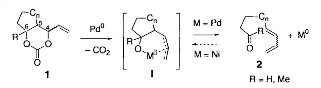 - ↑ Harayama, Hiroto; Kuroki, Toshitsugu; Kimura, Masanari; Tanaka, Shuji; Tamaru, Yoshinao (1997-11-14). "Synthesis of Doubly Unsaturated Aldehydes and Ketones by a Novelβ-Decarbopalladation". Angewandte Chemie International Edition in English. 36 (21): 2352–2354. doi:10.1002/anie.199723521. ISSN 0570-0833.