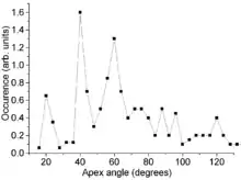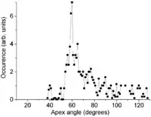 Statistical distribution of the apex values measured over 554 cones grown on natural graphite.[7]