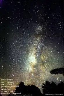 The Milky Way is a barred spiral galaxy, consisting of a central crossbar and bulge from which two major and several minor spiral arms radiate outwards. This arm lies between two major spiral arms, the Scutum–Centaurus Arm, the near part of which is visible looking inward, i.e. toward the Galactic Center with the rest beyond the galactic central bulge, and the Perseus Arm, similar in size and shape but locally much closer looking outward, away from the bright, immediately obvious extent of the Milky Way in a perfect observational sky.[1] It is named for its proximity to the Sagittarius and Carina constellations as seen in the night sky from Earth, in the direction of the Galactic Center.