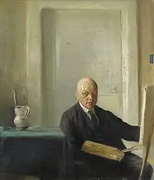 Holsøe's paintings include landscapes, still lifes and flowers, but like Hammershøi he primarily painted domestic interior scenes;[1] they undoubtedly influenced each other, but it is impossible to know who first gravitated towards this subject.[2] It was in general increasingly popular among Danish painters as the country became more industrial, with implications of refuge and restoration from professional life and the city.[5] Holsøe's works have come to be overshadowed by Hammershøi's: his coloration is less subtle and although there are characteristically one or sometimes a small group of figures, Holsøe's work is less innovative and unemotional by comparison with Hammershøi's expressionism.[1][2][6] In his mastery of form and enjoyment of the beauty of things—characteristically high-ceilinged rooms with mahogany furniture—he has been compared to the Dutch masters.[1][2] His paintings have been forged (with difficulty).