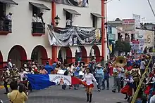 For this event, about 2,000 people participate, many of them soldiers from the Battle of Puebla reenactment.[2] The young people who play the couple are chosen each year.[1] This action takes place in front of the municipal palace, which stands in as the corregidor's home. One of the generals plays the role of the corregidor. The daughter receives three messages from the bandit.[2] The bandit enters the scene to music, fireworks and musket fire. The daughter is waits for him on the balcony, already dressed in white.[4] The bandit then climbs up to the balcony, subdues the soldiers guarding her and takes her down to his horse. Just before doing so, however, he tosses large amounts of play money to the crowds yelling “Viva la plata” (Long live money (lit. silver)). The couple escapes on his horse as one group of soldiers pursue and the rest of the soldiers fire at the pursuers.[2][5] At three pm, a priest marries Lorenzo and the daughter.[4] However, the story does not have a happy ending. At four pm is the “quema del jacal” (burning of the shack). This is the burning of a small shack made of palm fronds at one end of the plaza. It represents the house of the bandit with the couple inside. The legend has been interpreted as the hopes for equality among Mexico's social classes after its Independence as the daughter is of the elite and the bandit is poor. The shack is also interpreted as the various wars of Mexico from the “flower wars” of the Mesoamerican era up through much of the 19th century.[2][9] Simultaneous to the enactment of the Corregidor's Daughter story on the other side of the plaza is another reenactment. Huejotzingo was named one of the four regions to receive evangelizing first, with legend stating that the first weddings and baptisms in the Catholic rite in Mexico occurred here. Both the first wedding and the first baptism of the indigenous are reenacted.[2][4][6]