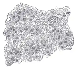 ![]() Section of part of human carotid body. Highly magnified. Numerous blood vessels are seen in section among the cells. | |