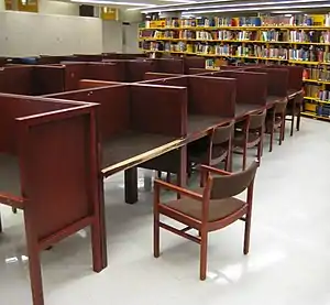 Carrel desks are especially common in academic libraries.[2] Sometimes the seat is integrated with the carrel desk. They may also have a shelf, built-in illumination, electrical outlets, or Ethernet ports.[1] Unlike the cubicle desk, carrel desks usually have no file drawers or other facilities. They are designed to stand alone or to be grouped together, with or without common sides or walls.