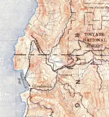 - ↑ United States Geological Survey (1893). Markleeville Sheet (JPEG) (Topographic map). 1:125,000. Reston, VA: United States Geological Survey. Retrieved July 17, 2018.