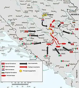 At the beginning of operation Schwarz, the Yugoslav National Liberation Army had 22,148 soldiers in 16 brigades.[9] There were 8,925 Partisans from Croatia (5,195 of those from Dalmatia), 8,293 from Bosnia and Herzegovina, 1,492 from Serbia (including Vojvodina and Kosovo) and 3,337 from Montenegro. By ethnicity 11,851 were Serbs, 5,220 Croats, 3,295 Montenegrins and 866 Muslims.[16][17]