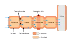 The chemistry of the Casparian strip has been described as composed of suberin. According to some studies,[8] the Casparian strip begins as a localized deposition of phenolic and unsaturated fatty substances in the middle lamella between the radial walls, as partly oxidized films. The primary wall becomes encrusted with and later thickened by deposits of similar substances on the inside of that wall. The encrustation of the cell wall by the material constituting the Casparian strip presumably plugs the pores that would have otherwise allowed the movement of water and nutrients via capillary action along that path.[9] The cytoplasm of the endodermal cell is firmly attached to the Casparian strip so that it does not readily separate from the strip when the cells are subjected to contraction of the protoplasts. At the root, the Casparian strip is embedded within the cell wall of endodermal cells in the non-growing region of the root behind the root tip.[10] Here, the Casparian strip serves as a boundary layer separating the apoplast of the cortex from the apoplast of the vascular tissue thereby blocking diffusion of material between the two.[11] This separation forces water and solutes to pass through the plasma membrane via a symplastic route in order to cross the endodermis layer.[10]