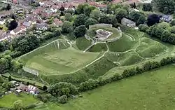 A fortified, planned settlement was built alongside the castle around this time.[21] The small community was not quite a proper town and was effectively dependent on the castle; such settlements are sometimes called burgus settlements or "castle-gate" towns.[22] The historians Oliver Creighton and Robert Higham suggest the settlement's earthwork defences and stone walls resemble an "enormous outer bailey" of the castle, rather a more conventional set of town walls.[23] The walled settlement would have formed an important symbol of William's lordship.[24]