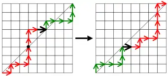 It can be seen that this process is reversible: given any path P whose exceedance is less than n, there is exactly one path which yields P when the algorithm is applied to it. Indeed, the (black) edge X, which originally was the first horizontal step ending on the diagonal, has become the last horizontal step starting on the diagonal. Alternatively, reverse the original algorithm to look for the first edge that passes below the diagonal.