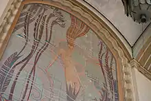 The theater's interior walls retain the original Art Deco murals by John Gabriel Beckman. The theater's entrance loggia, located between the two wings housing the ramps, feature nine mural panels of an Art Deco-style underwater world scene. In 1986, the center mural, depicting a mermaid, was restored using hand-painted tiles as originally envisioned. The restoration was with replications of Beckman's design created in Catalina Pottery-style tiles.[10] The lobby has walnut wood paneling.