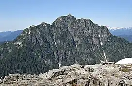 Cathedral Mountain is a 1,737-meter-elevation (5,699-foot) peak situated 25 kilometers (15.5 miles) north of Vancouver, in the North Shore Mountains which are a subrange of the Coast Mountains.[1] Precipitation runoff from Cathedral Mountain drains east to the Seymour River, and west to the Capilano River via Eastcap Creek. Cathedral is more notable for its steep rise above local terrain than for its absolute elevation. Topographic relief is significant as the summit rises 1,500 meters (4,920 feet) above Seymour Valley in three kilometers (1.9 mile). Access to the peak is off-limits because the mountain lies within the Metro Vancouver watersheds which provide clean drinking water to the city. There are radio repeater towers on the summit.