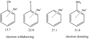 The electronic properties of the substituents also influence the strength of the attraction.[11] Electron withdrawing groups (for example, cyano CN) weaken the interaction, while electron donating substituents (for example, amino NH2) strengthen the cation–π binding. This relationship is illustrated quantitatively in the margin for several substituents.