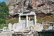 Turning to the south slope of the hill are the major religious sites of the sanctuaries of Dionysos and Asklepios. Beyond these lies a terrace west of the Asklepieion where there are a number of smaller sanctuaries. The Mycenaean spring on this site had been enclosed in a spring house since the archaic period and had been a centre for the cult of Pan, the nymphs and possibly Hermes since the 5th century BCE.[30] Its boundary was indicated by a horos built into the wall that defined the Peripatos.[31] Susan Walker identified this as a state cult.[32] A 1st century BCE inscription found in the location mentions Hermes, Pan, Aphrodite, the Nymphs and Isis.[33] Additionally a small temple in antis dating from the 2nd century CE is identified with Isis which according to epigraphic evidence was restored by a private patron. Pausanias describes a temple of Themis here directly behind a monument for the hero Hippolytus,[34] several Roman inscriptions denote Themis as the epiclesis of different goddesses.[35] Finally there are votive niches in bedrock west of the Asklepieion. This ad hoc development does suggest that this was a site of private pilgrimage rather than public ritual. Pala considers that the Aphrodite shrines of south slope may have been part of a pilgrimage trail, along with the Aphrodite cave on the north face where the goddess was worshipped in her kourotrophic aspect,[36] that brides and wives might have taken.