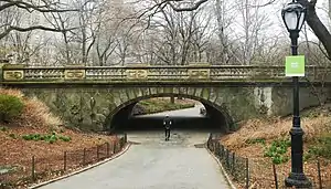 The frontage of Fifth Avenue apartment houses provides a backdrop to the east. At its southern perimeter stands the Glade Arch designed by Calvert Vaux, which originally provided carriage traffic with a conduit to Fifth Avenue. Hidden deep beneath the north end of Cedar Hill runs New York City Water Tunnel No. 3 with its valve chamber, completed in 1993, due to carry some of the city's drinking water in 2020.
