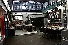 The interior of the Celebrity Big Brother house has a New York City theme from around the 1940s.[22] Each of the bedrooms on the first floor were given their own individual names reflecting their design. The first bedroom has a "5th Avenue" theme inspired by window shopping highlighting "the highest fashion of the '40s" while the second bedroom has a luxury "Hotel" theme. The third bedroom, known as the "Celebrity Building" Bedroom, that was inspired by a famous art deco building named after a car company.[19] The kitchen was inspired by some of the finest restaurants in New York City with a "faux French" oven island and a square dining room table. Behind the dining room table cartoon-style pictures of the season one HouseGuests hanging on the wall.[22] The bathroom and downstairs lounge area were inspired by the 20th Century Limited passenger train.[20] The Head of Household bedroom resembles the backstage of a Broadway show with the head board made from a real theater marquee.[21] The upstairs lounge was designed after the Brooklyn Bridge, while the gym area was inspired by the 42nd Street library in Manhattan.[23]