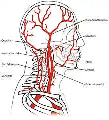 The carotid body is a group of chemoreceptor cells located at the bifurcation of the common carotid artery. It includes two populations of cells; glomus (type I) cells and sustentacular (type II) cells. Glomus cells are derived from the neural crest and secrete dopamine in response to hypoxemia (low level of oxygen in the blood).[10] Based on their ability to secrete dopamine and also glial cell-derived neurotrophic factor (GDNF),[11] these cells have been investigated as an intrastriatal autograft therapy for patients with Parkinson's disease.[12][13] A clinical trial exploring this initially demonstrated motor benefits, unfortunately these benefits disappeared after 6–12 months, in correlation with poor survival of the grafted cells.[14]