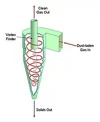 The key component of the gas-suspension preheater is the cyclone. A cyclone is a conical vessel into which a dust-bearing gas-stream is passed tangentially. This produces a vortex within the vessel. The gas leaves the vessel through a co-axial "vortex-finder". The solids are thrown to the outside edge of the vessel by centrifugal action, and leave through a valve in the vertex of the cone. Cyclones were originally used to clean up the dust-laden gases leaving simple dry process kilns. If, instead, the entire feed of rawmix is forced to pass through the cyclone, a very efficient heat exchange takes place: the gas is efficiently cooled, hence producing less waste of heat to the atmosphere, and the raw mix is efficiently heated. The heat transfer efficiency is further increased if a number of cyclones are connected in series.