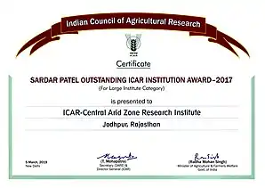 The Central Arid Zone Research Institute (CAZRI) is one of the biggest research institutes of the Indian Council of Agricultural Research (ICAR), an autonomous organization working under the aegis of the Department of Agriculture Research and Education (DARE) of the Ministry of Agriculture and Farmers Welfare of Government of India. CAZRI has the distinction of being one of the first institutes in the world exclusively devoted to arid zone research and development. The institute made a humble beginning in 1952 when Government of India initiated Desert Afforestation Research Station at Jodhpur to carry out research on sand dune stabilization and for establishment of shelter belt plantations to arrest wind erosion. It was reorganized as Desert Afforestation and Soil Conservation Station in 1957 and finally in its present form Central Arid Zone Research Institute in 1959 on recommendation of the UNESCO (United Nations Educational, Scientific and Cultural Organization) expert, Prof. C.S. Christian of the Commonwealth Scientific and Industrial Research Organisation (CSIRO), Australia. In 1966, the institute was brought under the administrative control of Indian Council of Agricultural Research (ICAR), New Delhi.