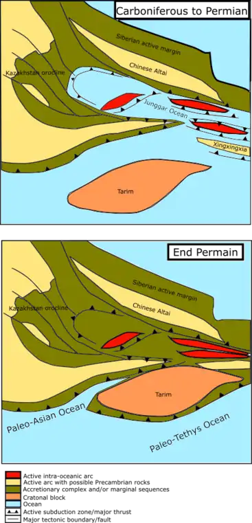 For the northern portion of the orocline, it contains Precambrian to early Paleozoic metamorphic rocks, Neoproterozoic ophiolites, volcanic rocks formed in the early Paleozoic island arcs, and some associated volcaniclastic sediments.[13] These rocks were then covered by the Devonian to Carboniferous sediments and were influenced by the volcanic activities during the Permian.[13] For the southern portion of the Tuva-Mongolia Orocline, the majority of rocks there are early to late Paleozoic volcanic rocks with ophiolites formed during ocean closures,[13] most notably the closure of the Palaeo-Asian Ocean that began in the Early Carboniferous[14] and ended in the Late Permian or Early Triassic.[15][16][17] The volcaniclastic sediments formed during Late Carboniferous to Permian were also common in this region.[13] For both portions in the Tuva-Mongolia Orocline, intrusions of granites occurred after the mountain building events and were covered by the volcanic and sedimentary rocks which formed during Jurassic to Cretaceous.[13]