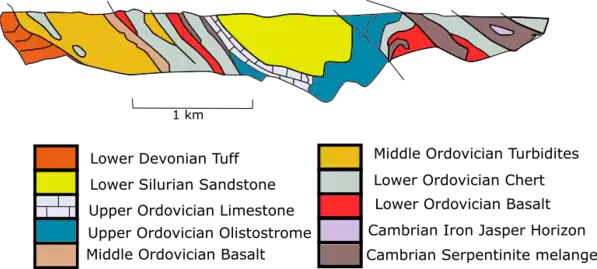In Precambrian time, the major terrane of the Kazakhstan orocline was mainly Mesoproterozoic metamorphic rocks, which potentially had Gondwana affinity.[11] They were then covered by the sediments from Neoproterozoic and Cambrian to Lower Ordovician.[11] Island arc volcanic rocks, and chert formed in deep sea environments were the dominant rock types in Paleozoic.[11] By the end of the Ordovician and Silurian, the accretion of paleo-Kazakhstan completed, meaning that materials were added to the paleo-Kazakhstan at a subduction zone.[11] The subsequent Devonian and Carboniferous rocks deposited on paleo-Kazakhstan were mainly volcanic rocks formed from continental arcs.[11]