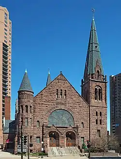 The arched entrances, a hallmark of the Richardsonian Romanesque style, feature a number of carved floral and geometric motifs.[2] The façade is coarsely carved Lake Superior brownstone with a massive 90-foot gable over the arches. The architect, Warren H. Hayes, laid out the seating in the Akron Plan. It features a raised semi-circular chancel, which places the speaker in the front of the congregation and at the center of the chancel. The pews are curved and laid out in a semi-circular pattern on a sloping floor. This design, similar to a theater's design, allows each person to see and hear the speaker.[3]