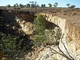 The Diamantina River's hook-shaped upper reaches have drawn scientific attention. In March 2015, Geoscience Australia reported that the river's course at and near its headwaters flows along the edge of a roughly circular crustal anomaly that might well be an impact structure. It is 130 km in diameter and lies some 60 km west of Winton; Middleton and Dagworth Station lie right in it. The asteroid impact, if indeed this is the explanation for the anomaly, would have happened roughly 300 million years ago.[6]