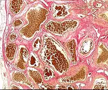 Cerebral cavernous malformation (CCM) is a cavernous hemangioma that arises in the central nervous system. It can be considered to be a variant of hemangioma, and is characterized by grossly large dilated blood vessels and large vascular channels, less well circumscribed, and more involved with deep structures, with a single layer of endothelium and an absence of neuronal tissue within the lesions. These thinly walled vessels resemble sinusoidal cavities filled with stagnant blood. Blood vessels in patients with cerebral cavernous malformations (CCM) can range from a few millimeters to several centimeters in diameter. Most lesions occur in the brain, but any organ may be involved.[1]