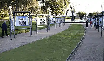 The twelve open-air exhibition spaces in the Montevideo neighborhoods of Parque Rodó, Prado, Ciudad Vieja, Goes, Peñarol, Unión, Casavalle, Espacio de Arte Contemporáneo, Plaza Cagancha, Capurro, Santiago Vázquez, and Parque Batlle present changing shows of photographs many of which are chosen each September by a panel of three judges from open submissions.[6] [7] Each exhibition consists of eighty or more weather-resistant digital prints mounted on 1 meter by 1.5 meter aluminum panels attached to welded-steel frames. The exhibitions are in public parks and pedestrian streets and are open every day of the year and also at night as the frames are illuminated. One rationale for the open air exhibitions is that they bring foot traffic to previously unfrequented public areas that might otherwise seem dangerous, especially at night.[8] These exhibitions have included a retrospective of the architecture of Óscar Niemeyer, Views of Paris (André Kertész, Marcel Bovis, Eugène Atget), the 2012 London Olympics by Agence France-Presse, and the work of individual photographers such as Sebastián Szyd, João Marcos Rosa, Nacho Seimanas, Laura D'Andrea, Marcelo Isarrualde, and Andrea López.[4]