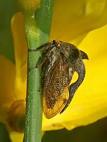 They can be encountered from early May through early August.[3][4] Both males and females produce vibrational signals during courtship and they are able to jump as orthoptera. After mating at the end of June and early July the females lay several eggs in the stalk of herbaceous plants, on which hatching larvae feed. These "treehoppers" are polyphagous, feeding on plant juices, which they take with their specially built, piercing-sucking mouth parts. The larvae mainly live on Cirsium, Carduus and Urtica species, while the adult insects prefer Populus, Quercus and Rubus species.[3] They overwinter in the litter layer in the larval stage and have a two-year life cycle.