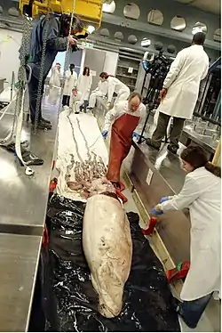 Scientists measuring the mantle width of a large female giant squid of c. 2 m (6.6 ft) ML