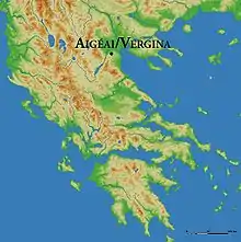 Aigai served as the capital of Macedon until the fifth century BCE, when the capital was moved to Pella. After this move the area was still used as a burial site for elite and royal families.[2] The shield was discovered in the second of three tombs being excavated as part of an archaeological dig in 1976.[3] It was accompanied by other military related artifacts and the remains of a middle-aged man and woman.[4]