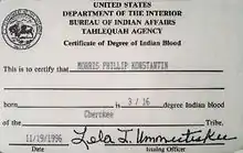 A Certificate of Degree of Indian Blood or Certificate of Degree of Alaska Native Blood (both abbreviated CDIB) is an official U.S. document that certifies an individual possesses a specific fraction of Native American ancestry of a federally recognized Indian tribe, band, nation, pueblo, village, or community.[1] They are issued by the Bureau of Indian Affairs after the applicant supplies a completed genealogy with supporting legal documents such as birth certificates, showing their descent, through one or both birth parents, from an enrolled Indian or an Indian listed in a base roll such as the Dawes Rolls. Blood degree cannot be obtained through adoptive parents.[1] The blood degree on previously issued CDIBs or on the base rolls in the filer's ancestry are used to determine the filer's blood degree (unless they challenge them as inaccurate). Information collected for the filing is held confidential by privacy laws, except if the CDIB is related to assigned duties.[1]