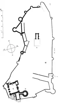The tower built in the first quarter of the 12th century contained a hall, chapel, and a room for the lord, but no small rooms for a complicated household arrangement; in this way, it was similar to towers at Corfe, Norwich, and Portchester, all in England.[3]
