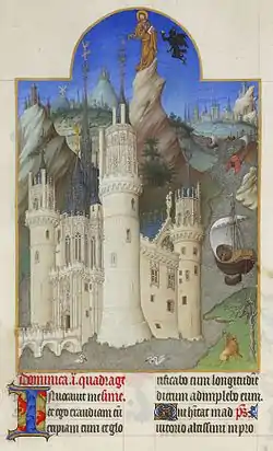 ![]() An illuminated page from the Très Riches Heures du duc de Berry featuring an image of the Château de Mehun-sur-Yèvre, Folio 161v | |