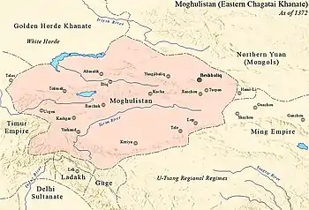 ![]() The Chagatai Khanate, with contemporary polities circa 1300, before the expansion of the Timurid Empire into Transoxonia from 1363.[3] | |||||||||||||||