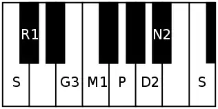 - ārohaṇa : S R₁ G₃ M₁ P D₂ N₂ Ṡ[lower-alpha 1]