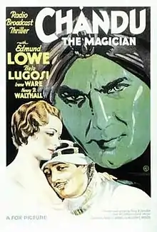 Chandu the Magician is a 1932 American pre-Code mystery-fantasy film starring Edmund Lowe as Frank Chandler and Bela Lugosi as the villain Roxor that he must stop. Based on the radio play of the same name, written by Harry A. Earnshaw, Vera M. Oldham and R.R. Morgan.[1] The radio series was broadcast from 1932 to 1933, and Fox obtained the rights hoping the film would appeal to a ready-made audience. In 1934 Chandu returned in a twelve part serial, The Return of Chandu, with Bela Lugosi playing the title role.[2]