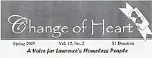 Change of Heart is a quarterly street newspaper produced and sold in Lawrence, Kansas. It was founded by Craig Sweets in late 1996.[1][2] who says the idea of starting a street newspaper was given to him by Michael Stoops, the director of the National Coalition for the Homeless.[3][4] The paper is a member of the North American Street Newspaper Association (NASNA),[5] and is the only street newspaper in Kansas.[1]