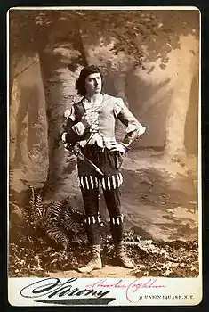 In 1876 Augustin Daly brought Coghlan to America where he would spend the greater balance of his career. He made his Broadway debut on 12 September 1876, at the Fifth Avenue Theater, as Alfred Evelyn in Lord Lytton's Money and was an instant success. Two months later, at the same venue, Coghlan played Orlando opposite Fanny Davenport's Rosalind in Shakespeare's As You Like It.[7] The next season Coghlan was engaged as the leading man at the Union Square Theater, where he played Jean Remind during the successful run of Augustus R. Cazauran's The Celebrated Case. He returned to London in 1881 to play Col. Woods, U.S.A. in the long-running The Colonel, produced at the Prince of Wales. On 13 December 1890 Coughlan was declared bankrupt[8] He had liabilities of £315.[9] The pinnacle of Coghlan's near twenty-five-year career in America came on 2 December 1898, at the Fifth Avenue Theater in his own adaptation of the Dumas' play Kean titled The Royal Box, in which he played the part of the actor Clarence. This great success was tempered the following year by the failure of his play Citizen Pierre, in which he made his last New York performance. During his career Coghlan had played opposite his sister, Rose Coghlan, and in support of Lillie Langtry and Minnie Maddern Fiske. His last appearance on the stage was at Houston, Texas, on 28 October 1899, as Clarence in The Royal Box.[5][6]