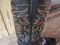 The most common motifs were the wearers' name or initials. Charlie teased, at $20 per letter (in 1977), "that's just cheap insurance against getting' 'em stolen."[60] SL Charlie liked to make fancy or unusual designs "[b]ecause a lot of people can't make 'em like that," just as he liked to make boots for people "who say they can't be fit." His supreme confidence in fitting anybody carried over to his making of designs: "most other boot makers won't work" with initials or names or designs "because they're afraid they won't fit and they'll be stuck with them."[48] Charlie refused payment for any boots that didn't fit, a rarity affecting only a handful of the thousands of pairs during his last decade of bootmaking.[49] He adorned fearlessly.