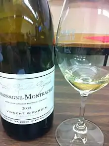 Chassagne-Montrachet wine is produced in the communes of Chassagne-Montrachet and Remigny in Côte de Beaune of Burgundy. The Appellation d'origine contrôlée (AOC) Chassagne-Montrachet may be used for white wine and red with respectively Chardonnay and Pinot noir as the main grape variety. The production consists of around two-thirds of white wine and one-third of red wine, which is produced primarily in the southern part of the commune, in the direction of Santenay. There are three Grand Cru vineyards within Chassagne-Montrachet, with Montrachet the most well-known, and 50 Premier Cru vineyards.