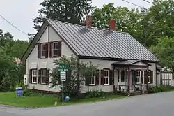The Chauncey B. Leonard House stands at the northwest corner of Shed Road and Crosstown Road, about 0.2 miles (0.32 km) west of Paine Turnpike, a historically major north–south route through the area, and just east of Pond Brook, impounded in historic times for the construction of mills. The house is a modest 1+1⁄2-story wood frame Cape style structure, with a gabled roof and clapboarded exterior. It is five bays wide and three deep, and faces Shed Road, now the access road to the town's municipal complex. The main entrance is sheltered by a porch with Victorian turned posts and balusters, and a spindled valance above. Ground floor windows on the facade facing Crosstown Road are topped by slight projections decorated with scallop-cut shingles, and the gable above has angled siding at the peak.[2]
