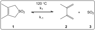 The effect of the solvent of the cheletropic reaction of 3,4-dimethyl-2,5-dihydrothiophen-1,1-dioxide (shown at right) was kinetically investigated in 14 solvents. The reaction rate constants of the forward and reverse reaction in addition to the equilibrium constants were found to be linearly correlated with the ET(30) solvent polarity scale.