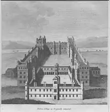 Building was begun on a piece of ground called Thame Shot (or Thames Shot), a site of six acres,[2] crown lands from Westminster Abbey obtained at the Dissolution of the Monasteries, and leased by Sutcliffe from Charles Howard, 1st Earl of Nottingham.[3] The College was to have consisted of two quadrangles, with a piazza along the four sides of the smaller court. Only one side of the first quadrangle was ever completed; and this range of buildings cost, according to Thomas Fuller, above £3,000.[1]