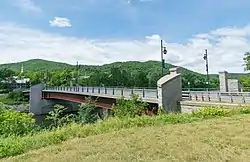 The bridge has a slight, gradual curve to it, allowing Chelsea Street and Route 110 to line up. The curve is more subtle than the prior structure, which had an "infamous crook" in it, as it was built using an older approach.[2] The bridge's sharp turn served to slow down automobile traffic entering the pedestrian-oriented village.[1]