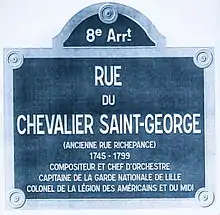 From 1757, Saint-Georges lived at 49, Rue Saint André des Arts with his parents. In 1774 he lived at Rue Guénégaud (also 6th arrondissement of Paris) with his mother.[151] In 1777 he lived at Rue des Fontaines-du-Temple, in 1778 at Rue Saint Pierre, both in Le Marais; in 1779 he moved to 5, Chaussee d'Antin.[182] After 1785 he lived in the Palais Royal.[183] In September 1789 he stayed at Grenier's in Jermyn Street (Westminster) patronized by French refugees. In 1791 he lived at 550, Rue Notre-Dame, Lille.[184] On 17 May 1793 he appeared as a witness at the Tribunal Révolutionnaire in a case against the Polish general Jozef Miaczinsky and gave his address at Rue des Filles-Saint-Thomas.[136] In March 1796 he lived at rue Jean Fleury (near Saint-Germain l'Auxerrois).[185] In 1799, when he was sick he lived Rue de Chartres-Saint-Honoré across the Palais-Royal but this street disappeared. On 9 June 1799, Saint-Georges died at his friend's Duhemal apartment Rue de Boucherat 13, (Le Marais).[179] He was buried at Cimetière Sainte-Marguerite.[186][187]