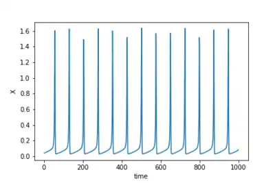 in which, is called activation or action potential variable, and is the recovery variable. The model has four parameters, is a time-dependent additive perturbation or a constant bias, is the time constant of recovery , is the activation-dependence of the recovery process and is an offset constant. The model has a rich dynamics, presenting from oscillatory  to chaotic behavior,[4][5] as well as non trivial responses to small stochastic fluctuations.[6][7]