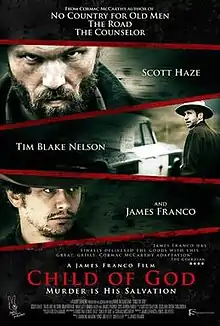 Child of God is a 2013 American crime drama film co-written and directed by James Franco, and starring Scott Haze, based on the novel of the same name by Cormac McCarthy. It was selected to be screened in the official competition at the 70th Venice International Film Festival and was an official selection of the 2013 Toronto International Film Festival.[1][2][3] The film made its United States premiere at the 51st New York Film Festival and then was screened at the 2013 Austin Film Festival.[4][5]